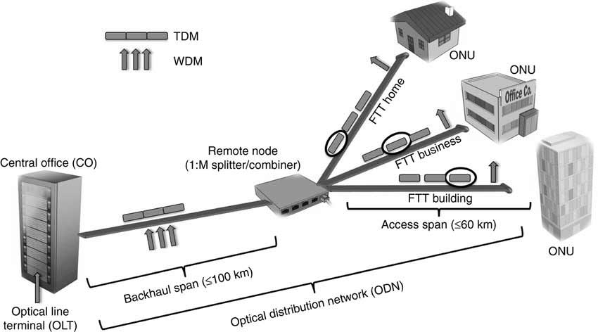 It transmits data from the central site to the optical network terminal (ONT) or optical network unit (ONU) at the user end, and vice versa.